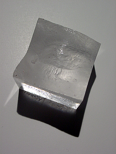 This small cast glass cube has five smooth sides, and one side that contains a casting of someone's closed left eye... the casting is quite detailed, and even shows eyelashes. The bottom of the work bears the following inscription in Icelandic: