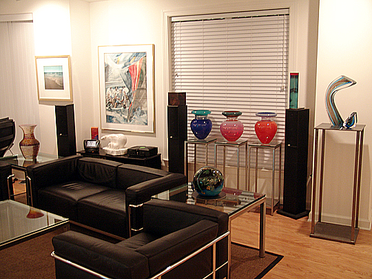 on shelves, top to bottom, left to right: Josh Simpson: Grey Vase Stephen Gleasner: Night On Clouds John Littleton and Kate Vogel: Acro Bags Toots Zynsky: Bisbiglio Lino Tagliapietra: Chasing Sonja Blomdahl: B102 Toshio Iezumi: F.020999 Josh Simpson: Inhabited Planet, Black New Mexico Vase, Microplanet, Gravitron, AP 95.05, and Mars Prototype Clay Johanson: @Simpson 1 and @Littleton/Vogel 1 Michael Trimpol: Bubbleweight Nadège Desgenétez: Two-Tone Vase Tobias Møhl: Konkylie (Conch Bowl) Dick Huss: White Opal Gold Leaf Bowl Josh Simpson: Iridescent New Mexico Vase Benjamin Moore: Uranium Yellow Interior Fold Natalie Warrens: Large Bowl Josh Simpson: New Mexico Plate on wall, left to right: Wolf Kahn: Acacia (Namibia) Bob Rankin: Big Blue (above Runco 50" plasma TV) Ernesto Berra: Muro Azul / Rosa Rojo Bob Rankin: Anderson Ranch on pedestals, left to right: Martin Rosol: Open Plan XV Colin Reid: Blue Block Preston Singletary: Soul Catcher Rick Beck: Medium Casting (below Soul Catcher) Sonja Blomdahl: B103 (below Soul Catcher) Dale Chihuly: Cirrus White Basket Set with Lamp Black Lip Wrap |