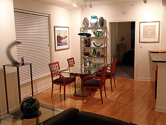 left to right: Harvey K. Littleton: Blue/Yellow Vertical Arc Josh Simpson: Dark Persephone Thomas McNickle: Winter Shadows From The Hilltop on shelves, top to bottom, left to right: Benjamin Edols and Kathy Elliott: Black Reticello Crease Sonja Blomdahl: B104 Josh Simpson: New Mexico Vase Mel Munsen: Black Murrine Bowl with Teal Rim Toots Zynsky: Settling Serena John Littleton and Kate Vogel: Bag Explosion Steven Weinberg: Sydney's Boat various small works on dining room table: Jon Kuhn: Roman Blue on wall, right of the door: Richard Stenhouse: The Forbidden Room in office: Jon Kuhn: Winds So Blue Robert Irwin: Red, White, and Blue II on counter: Ikuzi Teraki: Carved Plate |