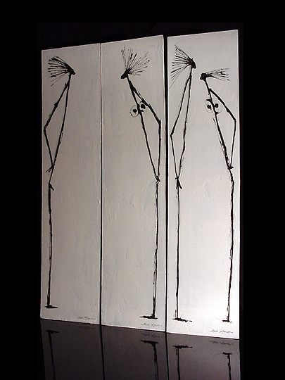 This series is an unusual one... basically, there are two kinds of figures, males and females. You can tell a bit about each figure by their stance and the shape of their hair. In this way, each work tells a story of sorts. I have three works: the first shows a male by himself, the second shows a female by herself, and the third shows them together. How do you think things are going between them? Click here to return to the Collection. |