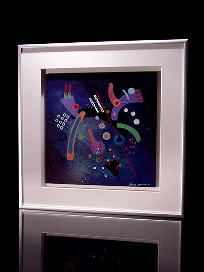 Rankinsky (ran kin' ski), n. 1. a work of art by Bob Rankin in the style of, or at least inspired by, the works of famed Russian artist Vasili Kandinsky (1866-1944). 2. a pun on the artist's name. When I went to visit my Mom for Thanksgiving 1999, I (naturally) paid a visit to Bob Rankin's studio to see what new styles of work he'd developed. Since his annual Holiday Houdio show (houdio = house + studio) was the week after Thanksgiving, he had come up with quite a few new styles of work, many of which were inspired by his trip to Italy earlier in the year. This style, however, is based somewhat on an earlier style of Bob's known as "Shape Whimsy"... seemingly random shapes arrayed in front of a backdrop of some sort. These works have great energy... there are a multitude of colors and shapes. Some of the shapes (small circles) are connected by lines so that they resemble stellar constellations, while others interlock with each other or float free. The background uses a really cool gradient of black and purple that looks a lot like space, or the space within a nebula. Finally, there are quite a few specks of white throughout the work; these are made by flicking a toothbrush loaded with paint at the canvas... half of the paint goes on the canvas, and half of the paint goes on the artist. :-) Very cool! (You may also want to check out Rankinsky's Pick-Up Sticks.) Going down the page, these works are Rankinsky 1 and Rankinsky 2. Scroll down to see the complete set of these works. Click here to return to the Collection. |