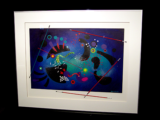 This work is a development of Bob's Rankinsky Series... whimsical, colorful, high-energy shapes against a dark background. However, this much larger work also includes a new element... three-dimensional sticks that are placed in front of and around the work. I think this is a really neat idea, and really makes this work stand out. The name Rankinsky's Pick-Up Sticks is a combination of the Rankinsky/Kandinsky pun and the name of the old game "Pick-Up Sticks" (in which you have to remove one stick from a pile without disturbing any other sticks). Click here to return to the Collection. |