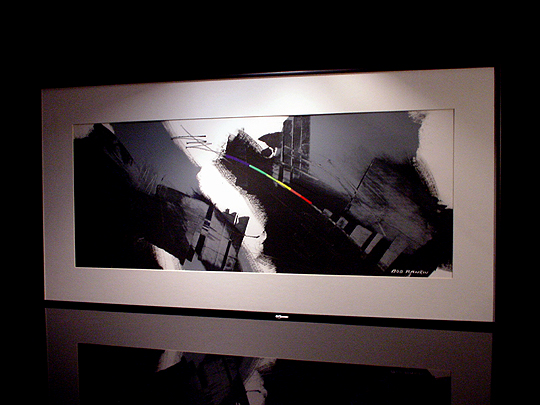 I am a big advocate of monochromality... that is, I really like black and white and grey in art. This work consists solely of monochromes, except for a small stripe of color near the centre of the work that stands out in sharp contrast. Also, this work is in an unusual aspect ratio... it's very wide compared to its height. When Bob told me the exact size of this work (framed, it's 38" x 19"), I pointed out to him that the work basically was the shape of two squares side-by-side. I think the eye picks up on this fact unconsciously, adding to the appeal of the work. (Hey, it works for me!) Check out Bob's work Ethereal for another example of a work with an unusual aspect ratio. Click here to return to the Collection. |