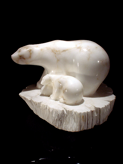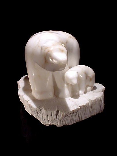 I first saw this sculpture in 1993 (I think... memory fades with time), when my sister Lee was working at the gallery. I loved this sculpture the instant I saw it, and went to the gallery to see it every time I visited Annapolis. Every time I visited the gallery, I told the owner, "Someday I'm going to buy that sculpture." When I visited the gallery in November 1997, I made my usual comment about the sculpture. The owner told me that another customer had been doing the same thing for years... visiting the gallery occasionally and talking about buying the sculpture. So, in December 1997, I finally made the decision to purchase the bears, before somebody else got them. This is one of my favorite works of art... especially since it was so long coming. One thing I really like about this sculpture is that it is so stylized. The artist did not attempt to add much detail to the bears themselves... you get a bear shape, but no fur or eyes or anything like that. The polar bear, or ursus maritimus (Latin for "maritime bear", because they spend so much time on the ocean), is one of the most magnificent creatures on the planet, as well as the most ferocious carnivore on land. I love polar bears because they are so beautiful and because they have so much personality. Check out any of the nature shows on the Discovery Channel to see what I mean... when they're not attacking something, they can be quite amusing to watch. Also, because they are basically monochrome (lemony white fur, black eyes), they just look cool (pun intended) to me. The two bears in this sculpture are a mother and her cub; a male polar bear would instantly kill a cub (even his own) given the opportunity. Scroll down to see more shots of this work. Click here to return to the Collection. |