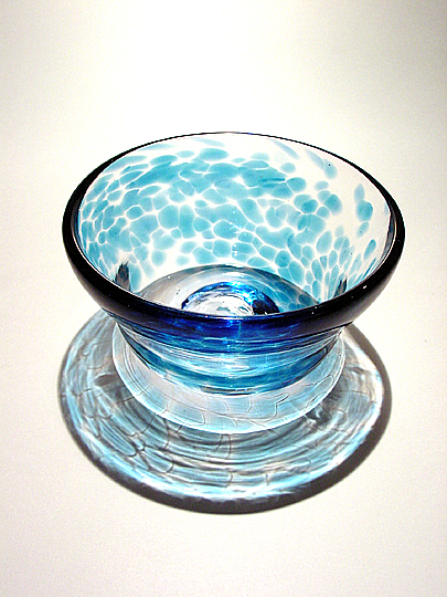 After my first attempt at glassblowing (@Littleton/Vogel 1), John Littleton suggested something a little more ambitious for my second attempt: a bowl. This would involve the use of a blowpipe, rather than just a plain old solid pipe. I said, "Sure, let's try it!" As before, we laid out some blue frit on the marver. Since blowing glass is harder than just working with it, John performed all of the gathers for this work... once the gather was the right size, I created a bubble in the glass by blowing into the pipe. This was the beginning of the bowl. We added color to the work by rolling the work through the frit on the marver, and then added another gather of clear glass. The problem at this point was that the opening into the bubble was attached to the blowpipe. So, while I kept the work rotating, John took a solid pipe, added a small gather to it, and created what is called a punty. With both pipes rotating, John attached the punty to the bottom of the work. I used the jacks to score the glass connected to the blowpipe... then all it took was a tap on the blowpipe to detach it from the bubble, which was now connected to the punty. To create the bowl shape, I used jacks to steadily widen the opening of the bubble. I also used wooden paddles to try to straighten out the outer surface of the bubble. (As you can see, I was not entirely successful!) A few reheats in the glory hole were necessary to complete all of the working with the glass. When we were done, I used the jacks to score the glass connection to the punty, tapped the punty, and the glass fell into John's gloved hands. A quick trip to the annealing oven, and the bowl was complete! The end result of this is pretty good for a beginner... in particular, I really like the shadow cast by this work. Needless to say, this work probably wouldn't look anything like this without John's expert assistance. I'm glad to have had the opportunity to create this work of art. Click here to return to the Collection. |