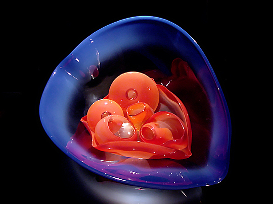 Dale Chihuly is probably the most widely-recognized glass artist in the world... his works are included in countless museum and private collections, and his major installations at locations as diverse as Las Vegas (the Bellagio), the Bahamas (Atlantis), and Venice (Chihuly Over Venice) have been viewed by millions of people. So, it should come as no surprise that when I first started looking at studio glass, I looked at Chihuly's work first. In Charlotte, there's only one gallery (Jerald Melberg Gallery) that carries Chihuly's work. Since I wanted to see the widest possible selection of works, I decided that I would look seriously at Chihulys when I went out to Seattle in November 1998 to work on the Microsoft Office 2000 Beta; Chihuly is based in Seattle, so naturally there are quite a few places there where you can view or purchase his work. I first saw this work at Foster/White's Kirkland location in November 1998. At the time, my first thought was "Wow, this is a seriously cool work of art." However, it wasn't until February 1999 that I returned to the gallery... when I did, I was informed that the gallery was about to start a new show of Chihuly's works (which was good), but that this work was going to be returned to Chihuly (which was bad, I thought). Before I missed my chance, I decided to acquire this work. This set is 19" tall by 25" wide by 22" deep. There are 8 elements in all; 1 large blue-and-transparent element, and 7 smaller red elements. All of the elements have black lip wraps, and the red elements include some small, barely noticeable black swirls. The red elements are also transparent on their undersides. The whole set weighs something like ten pounds... the glass is very thin. When properly lit, this work glows like neon... it looks completely unearthly. This set is particularly rare because two of the elements are signed by Chihuly... one element is signed "Chihuly 94", and another is signed "Chihuly 97". The reason for the 1997 signature is that three of the small red elements originally included in this work are no longer present, and were replaced by two new elements (the largest red element, and the "Chihuly 97" element) made in 1997. The things I like best about this work are its simple, elegant lines, and the contrast between the royal blue and the red... this is a great combination of colors. This is definitely one of the most beautiful pieces of art I've ever seen. I've never seen another Chihuly quite like it. Click here to return to the Collection. |