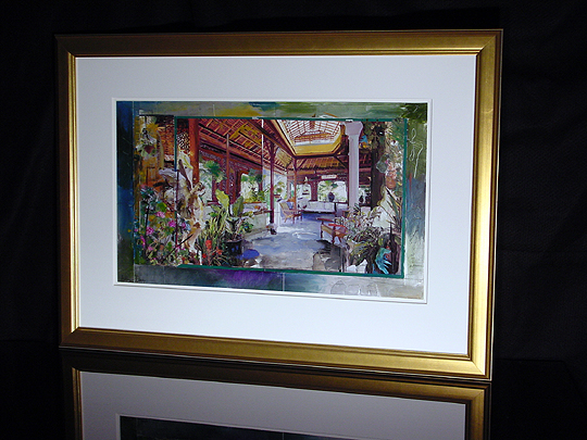 Arless Day is an artist who specializes in creating scenes that don't actually exist in real life. He does this with a combination of collage, using photos torn from magazines and books, and an opaque watercolor paint called gouache. Missing elements in the work are fixed by the application of paint, and some elements are created entirely from paint. This work is really beautiful... the depicted scene takes place in some sort of tropical cabana, and includes both Caribbean and Polynesian influences. The angel from the title appears in the front left of the scene, and the seven birds (one of which is really hard to see) are scattered about the interior of the cabana. I really like the lushness of this work... it's very green, very bright, and very vivid. It would really be cool if such a place as this existed in the real world... I would really like to visit it. Scroll down to see a closeup shot of this work. Click here to return to the Collection. |