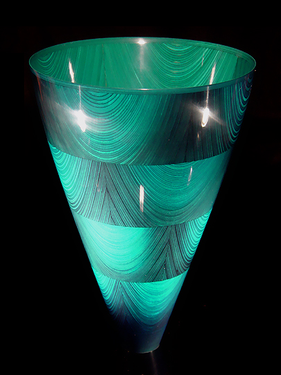 This work by Stephen Gleasner is simply amazing... from across the room, it almost looks like glass, but it's actually laminated plywood! After assembling plywood shapes (each ring of the vase is made by gluing together four pieces of plywood, which are then warped into a circular shape) into a rough vase shape, Stephen adds a solid wood base and a ring of wood around the opening to strengthen and stabilize it. He then turns the entire vase on a lathe, smoothing out any rough edges and producing a flawless surface. Once the form is complete, he airbrushes the vase with a variety of water-soluble pigments, whose values vary automatically because of the relative qualities of the wood rings in the plywood... each ring is not painted separately. They just come out that way naturally. (This is a good example of the artist allowing the materials to determine their own appearance, rather than trying to force them into a particular configuration.) Finally, Stephen coats the entire work with layers of clearcoat, to protect the pigments and to enhance the appearance of the work. As I said, the result of all of this is amazing... normally, I am not a big fan of works in wood, but the effect that Stephen has created is quite unique. I especially like the way this work seems to amplify any light that shines on it. Click here to return to the Collection. |