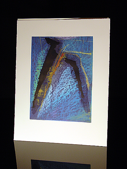 When I visited Harvey Littleton's studio during the weekend of the Penland Auction (August 11-12, 2000), Harvey very nicely took the time to show me around his studio, which includes the facilities that he uses to create very high quality prints of works by artists who come to his studio. Harvey had some of Herb Jackson's prints on display, and showed me others that he had produced in cooperation with Herb... I thought that this print was very nice, so I decided to acquire a copy of it from Harvey. Herb Jackson is well-known for his abstract works... this particular work, like Blue Point, features blue as the primary color. I was immediately attracted to the use of blue and the particular shapes in this work, especially the black shape that wends its way through the work. Two plates were used in the creation of this print, which is a vitreograph, or print made using etched glass plates. First, an intaglio plate using Gamblin Dioxin Purple (no actual dioxin, that's just the name of the color!) and Portland Cool Black was pressed into the paper, creating just a few of the lines you see in the print. Then, a digigraph transfer was created using an Encad Novajet Pro 36 color inkjet printer and Graphic Outdoor inks. This second image was captured using a very-high resolution digital camera (approximately 3000 by 5000 pixels in resolution) that Harvey has in his studio. This work bears the "chop" (an embossed symbol that indicates who worked on the print) of its publisher, Littleton Studios, and its master printer, Judith O'Rourke. Only 30 of these prints were created... it is truly a limited edition. I chose 26/30 for reasons which some of you out there may be familiar with... for the rest of you, suffice to say that the number 26 figures quite prominently in my life. :-) At any rate, this is a very nice print of a very nice work of art... Harvey has demonstrated excellence in printing just as he did in glassblowing. Click here to return to the Collection. |