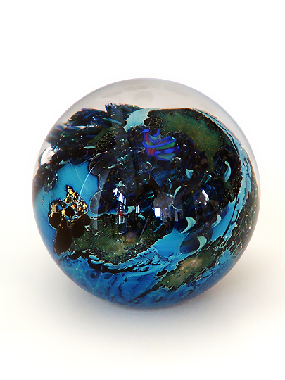 This small planet (not quite 3" in diameter) is quite similar to my Inhabited Planet. It came with a separate sample of the cane used to create the small blue-and-red "spaceship" that's flying above the surface of the planet, as well as a copy of the book Made by Hand: Art and Craft in the Heartland of New England, which includes a chapter about Josh's work. "AP" stands for "Artist's Proof"... as far as I can tell, Josh produced about 100 or so of these small works in early 2005. I really like the color configuration (blues and greens) of this work... as always, Josh continues to amaze. Click here to return to the Collection. |