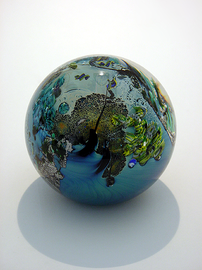 While I was in Seattle, I happened to visit the Northwest Discoveries gallery in Bellevue Square. They had a bowl on display (similar to my New Mexico Plate) that was created by an artist named Josh Simpson, whom I'd never heard of before. The accompanying book showed some of his other works, including his planets. I was intrigued, so I made a note to myself to check him out when I got back to Charlotte. After I returned to Charlotte, I drove up to Raleigh to visit Bob Rankin. I happened to mention Josh Simpson to Bob, and he said, "Oh, I have one of his planets myself!" The planet Bob had was pretty cool, so I knew I would definitely like to see more planets. I found Josh Simpson's web site and sent an e-mail asking for the names of galleries in Charlotte and Atlanta that carry Josh Simpson's works. One of the names I got was the Vespermann Gallery in Atlanta. While in Atlanta working the Microsoft booth at the AIIM '99 conference, I drove to the Vespermann Gallery, checked out their selection of planets, and chose this one. Here's the funny part: When I returned to Charlotte to find my magnum weight waiting for me, I saw that the box in which the weight was shipped was originally shipped from the Vespermann Gallery in Atlanta! This planet is approximately 4" in diameter, and contains quite a bit of surface detail. This planet features forests, sea life (in the form of anemones), and a few spaceships flying above the surface of the planet. If you look through the base of this planet, there is even some detail inside the planet. I think it's incredible how much detail you can see in this work... for even larger and more impressive examples of planets (megaplanets), see Dark Persephone and Verdant Ceres. Scroll down to see a reverse shot of this work. Click here to return to the Collection. |