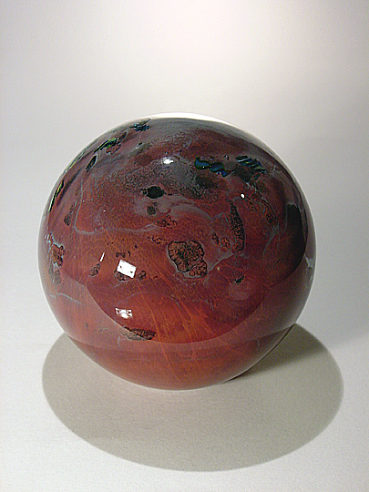 Josh is very well-known for his planets and megaplanets... they are included in many private and museum collections, including the White House Craft Collection and the collection of the Mint Museum of Craft + Design in Charlotte, North Carolina. However, Josh's planets are usually not based on any existing planet... they tend to be fantastic creations. In this case, however, the planet is modeled after the planet Mars. Josh has done an awesome job of matching the color of this planet to the real Mars, and some of the Martian geography on this planet is similar to the real Mars. Of course, it wouldn't be a Josh Simpson planet if there weren't some spaceships orbiting it, and there are some here... perhaps they belong to colonists arriving on Mars in the future. This work is labeled a prototype because Josh was considering creating a much larger Mars for NASA... Josh's wife, Cady Coleman, is an astronaut who has flown on two Space Shuttle missions and who was in charge of deploying the Chandra X-Ray Observatory a few years ago. I am a big fan of both Mars and of Josh's work, so I am doubly glad to have this work in my collection. Scroll down to see a reverse shot of this work. Click here to return to the Collection. |