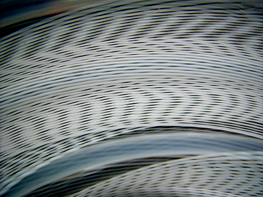 I'm not sure why, but there are quite a few artists who work in glass who are either from Scandinavian countries, or who have gone there to study the art of glass. Just within my collection, for example, I have works by Æsa Björk Thorsteinsdóttir (Icelandic, lives in Norway), Sonja Blomdahl and Preston Singletary (both lived and worked in Sweden for some time), and Dale Chihuly (part of his Chihuly Over Venice show was filmed in Finland). Maybe they just like the warmth of furnaces and kilns. Tobias Møhl is a Danish glassblower who works in the Muranese style of Venetian glassblowers... he has worked with Lino Tagliapietra for several years, and his work shows Lino's influence. This bowl is a superb example of his work. As near as I can tell, what Tobias has done is to create an incredibly long cane of glass in the shape of a ribbon cable, consisting of alternating strands of clear and white glass. (How he did this, I'm not sure. Usually, cane doesn't come out flat.) Then, he created a vessel of clear glass on a blowpipe and wrapped the cane around and around the vessel, completely covering the outside of the vessel. Finally, he used the blowpipe to expand the vessel to its ultimate size and smoothed the inside of the bowl. The result is very cool... the outside of the bowl is rough and heavily layered with ribbons of glass, and the inside is perfectly smooth. Even though this work is totally devoid of color, the effect of the seemingly endless strands of clear and white glass, all overlapping each other, is mesmerizing. It looks complicated, but the reality is that it's very simple and elegant in construction. The name of this work, Konkylie, is Danish for "conch", hence the name Conch Bowl. Lino is reportedly a big fan of Tobias' work, and so am I... it's easy to see why. Scroll down to see a detail shot of this work. Click here to return to the Collection. |