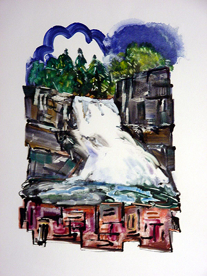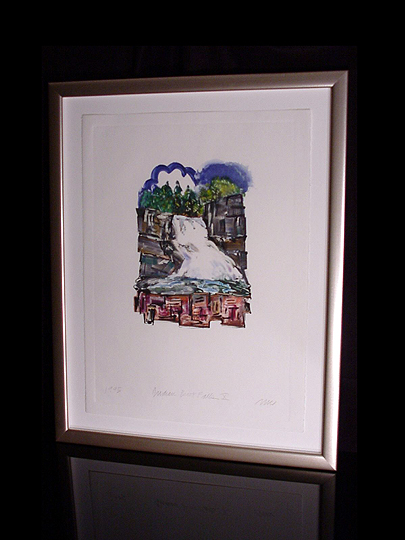 Many of Don Nice's more recent works feature views of and around the Hudson River in upstate New York. Indian Brook Falls is just north of Garrison, New York, where Don lives. You can view a page about Indian Brook Falls by clicking here. This work is a monoprint. A monoprint is created by painting, either with oils, acrylic, or watercolor, on a nonpermeable surface, such as a sheet of glass. Once the painting is complete, but before the paint dries, a sheet of paper is pressed into the painting. The result is the image you see. By its very nature, a monoprint is unique, since the original painting is destroyed when the paper is pressed into it. One result of the monoprint process is that part of the image bleeds through to the back of the work, due to the pressure of the printing press. I like several things about this work... it uses bold but simple colors, so it's almost like an abstract work. The lack of a defining edge around the image is pretty cool, as well... and the patterns at the bottom of the image remind me a lot of Frank Lloyd Wright's Aztec-inspired wall tiles. The large border of white space around the image really makes it stand out. Don has created a series of monoprints of Indian Brook Falls... this is the tenth in the series. I've seen a couple of the other works in the series, but this is the one I liked best. Click here to return to the Collection. |