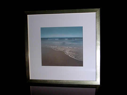 This is not, repeat not, a photograph. (Just in case you thought it was.) When I first saw one of the works from this series (this is the first in the series; there are at least two others) hanging on the wall at Jerald Melberg Gallery, my initial thought was "Wow, that's a pretty cool photograph." You can imagine my surprise when I moved closer and found that it was not actually a photograph, but a drawing executed in charcoal, pencil, and pastel by Richard Stenhouse. Of the three works in the series that I saw, this is the one that I liked the best. Huntington Beach State Park is located just a few miles south of Myrtle Beach, South Carolina... when I lived in Myrtle Beach (1973-1977), I visited the park several times, and I returned for a short visit in 2000. It remains totally undeveloped, in stark contrast to the endless miles of tourist beaches on both sides of the park. In this work, Richard has reproduced a calm beach scene with almost uncanny precision. The greyish brown of the wet sand, the gentle waves (there's a sandbar a ways out that prevents large waves from reaching the beach), the subtle blue of the sky, and the random nature of the foam in the waves are all pretty much perfect (at least as far as I am concerned). Like Richard's other works (see The Forbidden Room), this work has a dreamlike quality about it... nothing is too sharp, and the image blurs a bit as you get closer to its edge. It seems like a memory, recorded onto mylar for all to see. One thing that I really like about this work is how it contrasts with my first Stenhouse, The Forbidden Room. While The Forbidden Room is largely an exercise in straight lines, architectural perfection, and use of monochrome shading, Huntington Beach contains almost no straight lines, has no architecture whatsoever, and uses a subtle amount of color. Between these two works, Stenhouse's view of reality is, I think, quite well covered. Scroll down to see a closeup shot of this work. Click here to return to the Collection. |