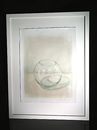 One concept that recurs frequently in my collection is the notion of things appearing to be something that they are not. For example, I have a wooden sculpture that appears, at first glance, to be made of glass; I have a painting that looks so much like a photograph that it fools almost everyone who looks at it; and I have several objects made of glass that normally would not be (a hammer, bags, a screw, Q-Tips). So, when I saw this painting depicting an object in glass, I was immediately drawn to it. A fishbowl is a difficult object to paint, for a couple of reasons. First, it's basically transparent; how do you paint something that has no color of its own, but which refracts light and still casts a shadow? And second, as a spherical, reflective object, it's going to reflect virtually everything in the room, especially windows and other light sources. If you don't properly address these issues, the result simply won't look realistic. Despite these challenges, Kit has captured the essence of a fishbowl extremely well. The detail she has applied is so comprehensive that it took me a few viewings of this work to notice it all... the reflections of windows, the bright pinpoint reflections of overhead light sources, the shape and coloring of the shadow cast by the fishbowl. In addition, Kit's use of color (or lack thereof... this is one of the most colorless works in my collection) is suitably subtle, just enough to properly capture the bowl, the surface upon which it rests, and the wall beyond. I also really like how this work is framed... just a plain white frame, with plenty of space between the work and the frame. Anything else might have risked nullifying the effect that the painting's lack of color creates. Ironically, an empty fishbowl contains plenty of potential symbolism... but I just like the bowl as an object. Glass, captured on paper. Click here to return to the Collection. |