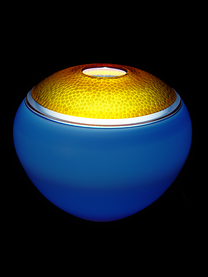 Continuing what has become a tradition, this is the first work that Sonja created in 2002... my "Collection of Firsts" also includes the first works that Sonja created in 1999 (B199), 2000 (B100), and 2001 (B101). This work is quite different from my previous Blomdahls... rather than a bowl/vase shape, this work is more spherical. In fact, Sonja used to call works in this shape "spheres", and even used to begin their names with "SP" for sphere, as opposed to "B" for the bowl/vase shapes. (Now they all have names that start with "B".) This work is created using the same incalmo technique that Sonja uses for her vases, but with a couple of different twists. While her vases usually include necks and large, flaring tops, this oblate sphere form uses a very simple transition between the upper and lower sections of the work. Using her considerable skill, Sonja created the upper section of the sphere with amber glass on the inside and green glass on the outside, and a thin band of clear glass separating the amber and green from the sky blue of the lower section. Once the glass was annealed, Sonja sent the work to a coldworking shop, where a grinding wheel was used to very carefully grind away most of the green glass to create a delicate web of green glass enclosing patches of amber glass. The result reminds me very much of what plant cells look like under a microscope. (Sonja's older spheres did not incorporate this technique.) I think this work is great... I love its form, I think the webwork of green and amber glass is incredible, and as always, Sonja has developed a set of colors that look awesome together. Scroll down to see more shots of this work. Click here to return to the Collection. |