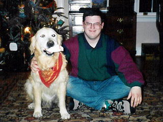 HERO (7 August 1981 - 14 October 1994) For me, still the archetypal golden retriever. Hero, whose full name was "Coombstock's Hero", came to live with me and my family when we were in England. He descended from a long line of goldens who have won quite a few awards in the United Kingdom and Ireland. He knew basic commands like "sit" and "stay", but was otherwise fairly undisciplined. In our north Raleigh house, Hero learned how to open the gate latches in our backyard by jumping on them with his paws, and he would go exploring, often with me chasing after him, any chance he got. (We finally had to use some of his old collars to secure each gate shut.) He could also lift even the heaviest trash can lid with his nose, so that he could find garbage to chew up and leave under the dining room table or kitchen table. A few things annoyed Hero greatly: thunder and lightning, fireworks, kites, remote control cars, and helium balloons were all guaranteed to make him bark. In this image, he is wearing one of his kerchiefs and holding his old punctured plastic football, a toy that he carried around for years. Hero passed away in 1994, and I still miss him. There will never be another like him. |