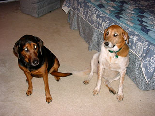 MOLLY (1991 - 2004) and SADIE (1991 - 2003) Molly and Sadie lived with my aunt, Marion Church. Molly (on the left) and Sadie were Walker hounds from the same litter. They used to be a couple of wild dogs when they were outside (they chased and caught cars, but never dragged one home!), but when they were inside, all they wanted was for someone to give them rubs. Marion used to leave a cart full of Milk Bones right out in the open, but Molly and Sadie wouldn't get into them unless you gave them a treat yourself. Sadly, Sadie passed away in 2003, and Molly passed away in 2004. They will both be missed. |