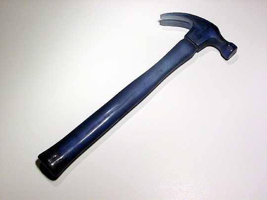 My main field of interest is in the unconventional use of glass as a sculptural material both in its representation and making. In the past I have used cast glass combined with various other materials and techniques such as video projections to express the aspects of the human body, its functions and dysfunctions. The glass hammers build on that experience and play with the paradox created by their role as incongruous fruit of self destruction, reflected both within the viewer when confronted with a fragile hammer, and in relation to the fragility of the glass house itself.Since I was unable to attend the auction, and therefore could not bid on Æsa's work, I decided to contact her to see if I could obtain a hammer from her directly. Ultimately, we communicated back and forth with each other for five months, entirely through e-mail. Within the first few messages, we had agreed on the type of work she would create for me: a cast glass hammer made with steel blue Gaffer glass from New Zealand. (Most of her other hammers were made using clear glass.) It ended up taking quite a while for the glass to journey from New Zealand to Norway, where Æsa has her studio, but she kept me advised as to the progress of the project. Finally, in early April, Æsa let me know that the hammer was complete and sent it to me. Basically, this hammer is the size of an ordinary hammer, just like you would use to hammer nails into a wall. There are some bubbles trapped within the glass, a result of the casting process. The outer surface is smooth to the touch, but not highly polished... so, you can see through the hammer, but it has more substance than if it were crystal-clear. Since I commissioned this work, Æsa offered to inscribe the work for me. The hammer bears the following inscription on the top of its claw: Áritaður blánættis hamar frá Æsu handa Clay JohansonThis is Icelandic, and translates to "a signed hammer of the blue night from Æsa for Clay Johanson". Blue is one of my favorite colors, especially in glass, so this is a really nice thing for Æsa to have inscribed on the work. I really like this hammer... the mere idea of it brings a smile to my face, and its name is especially ironic considering that I actually do live in a "glass house": I am surrounded by glass art, and my residence features very large glass windows which offer me excellent views of the city around me. It's very appropriate that I should have a work like this in my collection. Click here to return to the Collection. Postscript: Interestingly enough, Æsa and I learned through our e-mails that we were both at the Pilchuck School at the same time in August 2000... I visited and had lunch there one day, while she was working on casting a large concrete dome for an installation of hers in the show Clearly Brilliant. So, although we probably had lunch in the same room with each other, we've never actually met. Small world, huh? |
