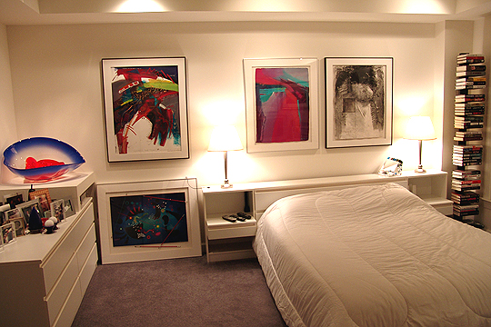 left to right: Harvey K. Littleton: Blue/Yellow Vertical Arc Josh Simpson: Dark Persephone Thomas McNickle: Winter Shadows From The Hilltop on shelves, top to bottom, left to right: Benjamin Edols and Kathy Elliott: Black Reticello Crease Sonja Blomdahl: B104 Josh Simpson: New Mexico Vase Mel Munsen: Black Murrine Bowl with Teal Rim Toots Zynsky: Settling Serena John Littleton and Kate Vogel: Bag Explosion Steven Weinberg: Sydney's Boat various small works on dining room table: Jon Kuhn: Roman Blue on wall, right of the door: Richard Stenhouse: The Forbidden Room in office: Jon Kuhn: Winds So Blue Robert Irwin: Red, White, and Blue II on counter: Ikuzi Teraki: Carved Plate |