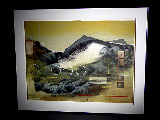 This work by Bob is simply amazing. For the past few summers, Bob has visited Anderson Ranch, an artists' community near Aspen, Colorado, to study with and learn from other artists, work on developing new techniques, and paint. This work incorporates more techniques than any work of Bob's I've seen previously... the result is quite impressive. The mountainscape shown in Anderson Ranch is in the Rocky Mountains, probably from the vantage point of the Anderson Ranch itself. Compositionally, this work is very similar to Bob's work Solo Surf Surface... both works include vignettes (the small boxes that depict other scenes) and architectural elements such as lines, circles, and boxes. Many of the mountainous areas in this work were made using collage. Unlike most of Bob's other works, Anderson Ranch is very muted... almost the entire work is comprised of earthtones, and there are no hints of blue or green anywhere. Also, the work lacks any of the usual texture that Bob's works contain... he told me that at some point in the process of creating this work, he took a squeegee to the painting and scraped away all of its peaks, rendering the entire work utterly flat. There are a few things about this work that I really love. This is probably the most "realistic" work of Bob's I've ever seen... usually, his landscapes tend to be impressionistic or use extremely vivid colors, but Anderson Ranch comes the closest to photorealism of any of Bob's works that I've seen. I also love all of the architectural elements and vignettes that are scattered throughout the work... I don't know why they work, but they really enhance the overall impression generated by the painting. This work has a sort of (and I hate to resort to cliché, but here goes) je ne sais quoi that I really like. This work was entered in the art show at the 2002 North Carolina State Fair in Raleigh, where it won the award for Best Painting by a professional artist. I'm very pleased to have this work in my collection. Click here to return to the Collection. |