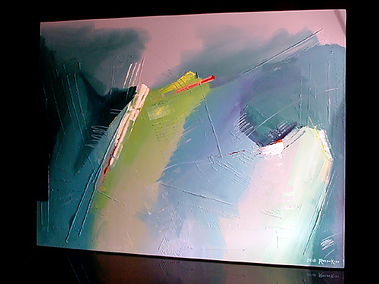 I acquired this work from Bob Rankin in December 1996, shortly before Christmas; in fact, it's the first original work I acquired from Bob. The combination of colors is really soothing to the eye, and it looks great over my television (which is exactly the same width, by a fortunate coincidence). Some folks have tried to figure out what the painting is supposed to represent... if you look closely, you may see the shape of a marlin or swordfish near the left-center of the painting. Personally, I like it just because I think it looks cool. This painting originally had no name... it was listed here as Large Untitled. When I mentioned this to Bob and told him about how some folks had seen a marlin in the painting, he suggested the name Blue Marlin. Since there used to be a restaurant in Charlotte called the Blue Marlin, I decided against this name... instead, because the painting is big and it's mostly blue, I decided to name it Big Blue. True story: This painting was too large (3' x 4') to fit in the Eclipse convertible that I owned at the time. My friend Susan Pexa was kind enough to take a day to drive up to Raleigh with me and bring the painting back in her car, which was large enough to hold the painting. Click here to return to the Collection. |