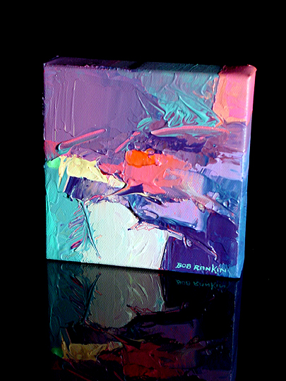 This tiny little canvas is only five inches square and one and a half inches thick. So, it can be hung on a wall or simply stood upright on any surface. Bob has created a series of these very small works, each depicting a different scene from his summer 2000 trip to New Mexico. I really like the energy and the colors in this work... plus, the very small size means that I can show it pretty much anywhere I want. Click here to return to the Collection. |