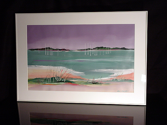 This is one of Bob's representational works. When he was younger, he spent quite a bit of time in Wrightsville Beach, North Carolina, not far from Wilmington. This view is across one of the sounds there (probably Masonboro Sound). I'm not sure exactly what the white vertical streaks are in the painting, but I think they're sunlight glinting off the water. My sister Lee commissioned Bob to create a series of small works similar to this one to give to her bridesmaids as presents. Bob painted one very wide scene and sectioned it into six pieces... so, each of the bridesmaids (and Lee) have pieces of one continuous scene. I thought this was a really neat idea. Click here to return to the Collection. |