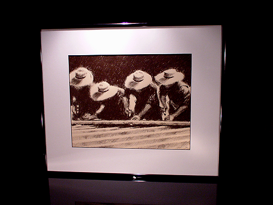 Beau specializes in pencil illustrations. Quite a few of his works feature the human figure, but this one really stood out when I saw it in his booth. This work is based on a black-and-white or sepiatone picture taken sometime during the 1920's in Pennsylvania. The original picture, according to Beau, shows eight or nine Amish farmers working on the frame of a barn that they are about to raise. Either by chance or by design, none of the farmers are looking up; they're all looking down at the frame while they work on it. This makes for an interesting image, as all you can really see of them is their traditional straw hats. Beau decided that four farmers was enough for this work, so he chose the four with the best "flow". This work is really distinctive... I like its simplicity, as well as its realism. Click here to return to the Collection. |