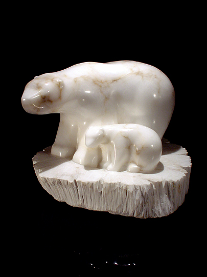 I first saw this sculpture in 1993 (I think... memory fades with time), when my sister Lee was working at the gallery. I loved this sculpture the instant I saw it, and went to the gallery to see it every time I visited Annapolis. Every time I visited the gallery, I told the owner, "Someday I'm going to buy that sculpture." When I visited the gallery in November 1997, I made my usual comment about the sculpture. The owner told me that another customer had been doing the same thing for years... visiting the gallery occasionally and talking about buying the sculpture. So, in December 1997, I finally made the decision to purchase the bears, before somebody else got them. This is one of my favorite works of art... especially since it was so long coming. One thing I really like about this sculpture is that it is so stylized. The artist did not attempt to add much detail to the bears themselves... you get a bear shape, but no fur or eyes or anything like that. The polar bear, or ursus maritimus (Latin for "maritime bear", because they spend so much time on the ocean), is one of the most magnificent creatures on the planet, as well as the most ferocious carnivore on land. I love polar bears because they are so beautiful and because they have so much personality. Check out any of the nature shows on the Discovery Channel to see what I mean... when they're not attacking something, they can be quite amusing to watch. Also, because they are basically monochrome (lemony white fur, black eyes), they just look cool (pun intended) to me. The two bears in this sculpture are a mother and her cub; a male polar bear would instantly kill a cub (even his own) given the opportunity. Scroll down to see more shots of this work. Click here to return to the Collection. |