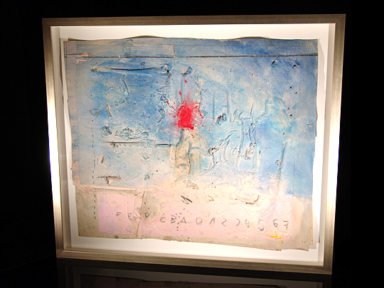 Since I first visited Jerald Melberg Gallery in 1999, I've become quite familiar with the works of Ernesto Berra... Jerald has represented him for quite a long time. However, even though I've seen many of Berra's works over the years, none of them ever really appealed to me. If you asked me why, I couldn't tell you; there was just something missing. Then, in June of 2005, I visited the gallery to see a new show of Berra's work. I didn't expect to see anything that I'd like, but quite the opposite happened: I liked every single work in the show. Of all of the works, this one spoke to me the loudest, and I knew I had to add it to my collection. Basically, this work is comprised of a few sheets of various types of paper and corrugated cardboard. The large sheet was then worked over with what looks like spackle or gel media, and then systematically abused (perhaps "weathered" might be a better word) before being painted. Finally, a series of (random? perhaps they represent grafitti) letters and numbers were added near the bottom of the work. The title, Muro Azul / Rosa Rojo, translates into Blue Wall / Pink Red... most of Berra's works are similarly literally-titled. The resulting work appears to me to be quite architectural in nature, and it should: The work is inspired by the decaying architecture of Cordoba, Argentina, Berra's home. This work is really three-dimensional... not only is the surface of the work heavily textured, but the sheet of paper and cardboard is itself distorted. I really like the combination of abstract and architectural elements in this work, as well as the subtle-yet-vivid coloring. The idea of painting something that's undergoing a more-or-less natural process of decay is also pretty interesting to me. Very cool. Click here to return to the Collection. |
