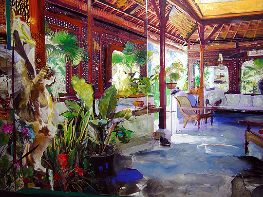 Arless Day is an artist who specializes in creating scenes that don't actually exist in real life. He does this with a combination of collage, using photos torn from magazines and books, and an opaque watercolor paint called gouache. Missing elements in the work are fixed by the application of paint, and some elements are created entirely from paint. This work is really beautiful... the depicted scene takes place in some sort of tropical cabana, and includes both Caribbean and Polynesian influences. The angel from the title appears in the front left of the scene, and the seven birds (one of which is really hard to see) are scattered about the interior of the cabana. I really like the lushness of this work... it's very green, very bright, and very vivid. It would really be cool if such a place as this existed in the real world... I would really like to visit it. Scroll down to see a closeup shot of this work. Click here to return to the Collection. |