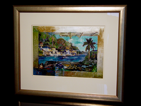 I've been a big fan of Arless Day's work ever since I acquired my first Day, Seven Birds And An Angel. Arless' constructed realities are more vivid than our own, and often depict idealized places... places that you think you remember, or that remind you of a place you've visited, but that don't actually exist. This work depicts an idealized Caribbean locale... perhaps one of the French or British islands, like Martinique or the British Virgin Islands. The buildings in the background, which represent mostly Caribbean influence with a touch of Venetian architecture, are clustered rather tightly together, as they would be if there were a limited amount of shoreline surrounded by hills with dense foliage. In the foreground, Arless has built a collage of lava flows from Hawai'i, along with an iguana and an easel in the lower-left corner of the work. The latticework in the upper-right corner of the work places us in our own building across the water from the town... perhaps the porch of a vacation house. What I really like about this work is how it depicts a calm, tranquil place that seems like a great place to just unwind from the stress of the modern world. The combination of blues and greens is very appealing to me. Of course, I also like Arless' pun... this work is truly a "timeless" Day. Click here to return to the Collection. |