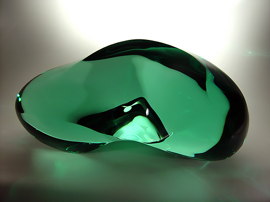 I first saw the work of Toshio Iezumi on Chappell Gallery's web page on the web site of the SOFA Expo, held in Chicago in the fall of 2000. As soon as I saw his work, I immediately visited Chappell Gallery's web site. What I saw there really amazed me, so I e-mailed Alice Chappell, the gallery owner, and after a series of messages, decided to acquire this work. The method that Toshio-san uses to create these works is not unlike carving stone, except that he doesn't use a chisel. First, he laminates a set of glass plates into a large mass; this is his "stone". Next, he uses a diamond-bladed saw to cut the mass into a rough form. Then, he uses a series of six increasingly-fine hand grinders to refine the outer surface of the form. Finally, he uses a felt buffer to polish the surface to perfection. The result of all of this effort is very cool... the shape and contours of the work cause it to reflect and refract light in myriad ways. The greenish tint of the glass (a result of the iron added to ordinary plate glass to give it strength) appears strongly or not at all, depending on the angle of viewing and the amount of light present. And the outer surface of the work is perfectly smooth. (The seams between the plates of glass in the work are only visible if you look at the work edge-on, or in just the right light.) Of all of the works in my collection, this work is the most abstract; it is basically just a shape. However, because of Toshio-san's considerable skill in working the glass, the surface creates wonderful effects using whatever light intersects it. The simplicity and elegance of this work really appeal to me... I'm glad to have this work in my collection. The name of this work, F.020999, tells you what type of work it is ("F" stands for "form") and when it was completed (February 9, 1999). Click here to return to the Collection. |