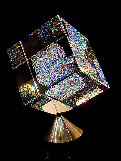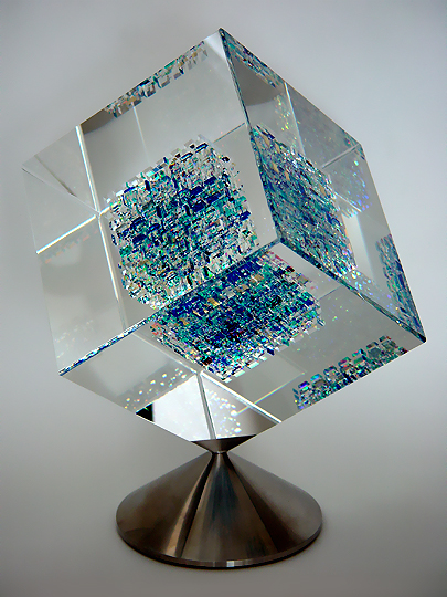 ACQUIRED FROM JERALD MELBERG GALLERY, CHARLOTTE, NORTH CAROLINA, JANUARY 2000 GROUND, POLISHED, AND LAMINATED BOROSILICATE, LEAD-FLUORIDE, AND COLORED GLASS, 8 3/4" CUBE WITH 4" CUBE INNER CORE, SIGNATURE ENGRAVED ON THE BASE BY THE ARTIST |