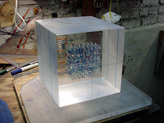 When I told Jon what specifications I wanted for my cube, he said, "I think we've got just what you're looking for." And he did: I wanted a cube 8" on a side with a core consisting mostly of blues... I wanted as many shades of blue as possible, and not much else. This work is an 8 3/4" cube whose core contains mostly blue, along with a smattering of red, silver leaf, and gold leaf. If Jon had not had this particular work already in development, it would have taken about six months to produce the kind of work that I wanted... so I was pretty lucky that he had it. This work was completed shortly before Christmas 1999. I have always been a bit of a perfectionist (those of you who are sniggering right now, knock it off!), so this work really appeals to me... its geometric perfection, along with the simplicity/complexity of its core, make Winds So Blue one of my favorite works of art. The way that it catches the light is simply amazing. The third picture of this work was taken shortly before Thanksgiving 1999 at Jon's studio, while the work was being polished. Scroll down to see more shots of this work. Click here to return to the Collection. Postscript: The original name of this work was Wind Over Camo, but Jon renamed it before I received it. Thanks to Mary Melberg for her suggestion of the phrase "controlled accident"... that's exactly what this work isn't. |