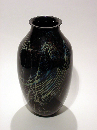 On the outside, this vase appears to be black... but when you look at it through the inside, you see that the black color is actually a very dark blue-green. There are some streaks of white and coppery-red, as well as a few bubbles trapped here and there within the glass. This work is very similar to Josh's red New Mexico bowl, although the use of color is somewhat different. Click here to return to the Collection. |