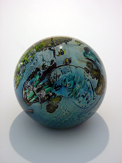 While I was in Seattle, I happened to visit the Northwest Discoveries gallery in Bellevue Square. They had a bowl on display (similar to my New Mexico Plate) that was created by an artist named Josh Simpson, whom I'd never heard of before. The accompanying book showed some of his other works, including his planets. I was intrigued, so I made a note to myself to check him out when I got back to Charlotte. After I returned to Charlotte, I drove up to Raleigh to visit Bob Rankin. I happened to mention Josh Simpson to Bob, and he said, "Oh, I have one of his planets myself!" The planet Bob had was pretty cool, so I knew I would definitely like to see more planets. I found Josh Simpson's web site and sent an e-mail asking for the names of galleries in Charlotte and Atlanta that carry Josh Simpson's works. One of the names I got was the Vespermann Gallery in Atlanta. While in Atlanta working the Microsoft booth at the AIIM '99 conference, I drove to the Vespermann Gallery, checked out their selection of planets, and chose this one. Here's the funny part: When I returned to Charlotte to find my magnum weight waiting for me, I saw that the box in which the weight was shipped was originally shipped from the Vespermann Gallery in Atlanta! This planet is approximately 4" in diameter, and contains quite a bit of surface detail. This planet features forests, sea life (in the form of anemones), and a few spaceships flying above the surface of the planet. If you look through the base of this planet, there is even some detail inside the planet. I think it's incredible how much detail you can see in this work... for even larger and more impressive examples of planets (megaplanets), see Dark Persephone and Verdant Ceres. Scroll down to see a reverse shot of this work. Click here to return to the Collection. |