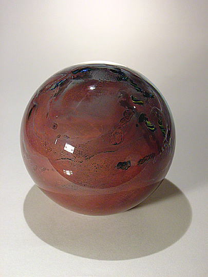Josh is very well-known for his planets and megaplanets... they are included in many private and museum collections, including the White House Craft Collection and the collection of the Mint Museum of Craft + Design in Charlotte, North Carolina. However, Josh's planets are usually not based on any existing planet... they tend to be fantastic creations. In this case, however, the planet is modeled after the planet Mars. Josh has done an awesome job of matching the color of this planet to the real Mars, and some of the Martian geography on this planet is similar to the real Mars. Of course, it wouldn't be a Josh Simpson planet if there weren't some spaceships orbiting it, and there are some here... perhaps they belong to colonists arriving on Mars in the future. This work is labeled a prototype because Josh was considering creating a much larger Mars for NASA... Josh's wife, Cady Coleman, is an astronaut who has flown on two Space Shuttle missions and who was in charge of deploying the Chandra X-Ray Observatory a few years ago. I am a big fan of both Mars and of Josh's work, so I am doubly glad to have this work in my collection. Scroll down to see a reverse shot of this work. Click here to return to the Collection. |