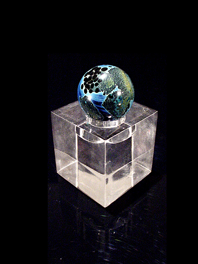 Although it is similar to the larger planet, this microplanet contains much less detail... mostly, you can just see the land and sea, although each does have some surface detail. The lucite base is necessary to keep this planet from rolling off the shelf. (Ha!) Click here to return to the Collection. |