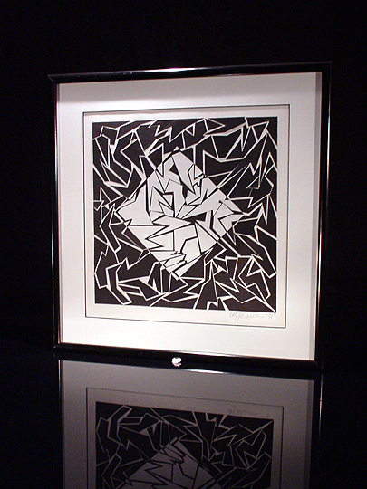 My sister Lee gave me this work as a present. She made it while she was a student at the University of Maryland, in 1991. The work consists of black and white paper, cut and glued onto a background. The effect is tense, but I like it because of its monochromality. Click here to return to the Collection. |