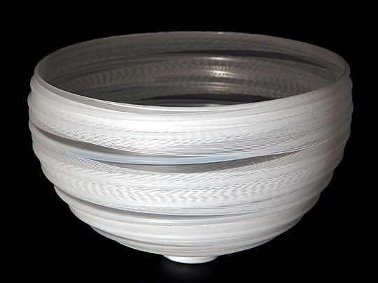 I'm not sure why, but there are quite a few artists who work in glass who are either from Scandinavian countries, or who have gone there to study the art of glass. Just within my collection, for example, I have works by Æsa Björk Thorsteinsdóttir (Icelandic, lives in Norway), Sonja Blomdahl and Preston Singletary (both lived and worked in Sweden for some time), and Dale Chihuly (part of his Chihuly Over Venice show was filmed in Finland). Maybe they just like the warmth of furnaces and kilns. Tobias Møhl is a Danish glassblower who works in the Muranese style of Venetian glassblowers... he has worked with Lino Tagliapietra for several years, and his work shows Lino's influence. This bowl is a superb example of his work. As near as I can tell, what Tobias has done is to create an incredibly long cane of glass in the shape of a ribbon cable, consisting of alternating strands of clear and white glass. (How he did this, I'm not sure. Usually, cane doesn't come out flat.) Then, he created a vessel of clear glass on a blowpipe and wrapped the cane around and around the vessel, completely covering the outside of the vessel. Finally, he used the blowpipe to expand the vessel to its ultimate size and smoothed the inside of the bowl. The result is very cool... the outside of the bowl is rough and heavily layered with ribbons of glass, and the inside is perfectly smooth. Even though this work is totally devoid of color, the effect of the seemingly endless strands of clear and white glass, all overlapping each other, is mesmerizing. It looks complicated, but the reality is that it's very simple and elegant in construction. The name of this work, Konkylie, is Danish for "conch", hence the name Conch Bowl. Lino is reportedly a big fan of Tobias' work, and so am I... it's easy to see why. Scroll down to see a detail shot of this work. Click here to return to the Collection. |