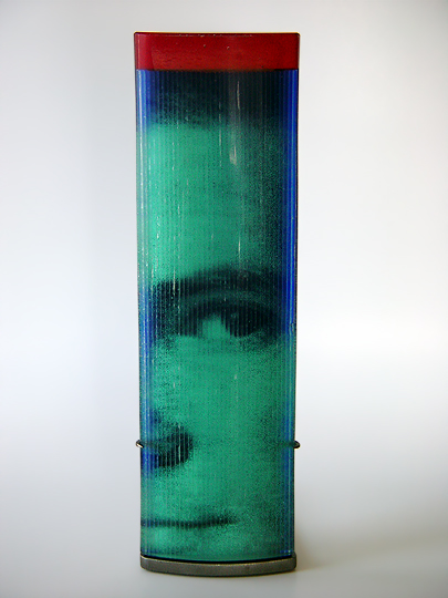 ACQUIRED FROM FOSTER/WHITE GALLERY, SEATTLE, WASHINGTON, MARCH 2003 FUSED GLASS WITH "PHOTO-ENGRAVED" HIGHFIRE ENAMEL PAINT AND STEEL STAND, 15 1/4" HIGH BY 4 1/2" WIDE BY 6 1/2" DEEP, SIGNATURE AND DATE ENGRAVED BY THE ARTIST |