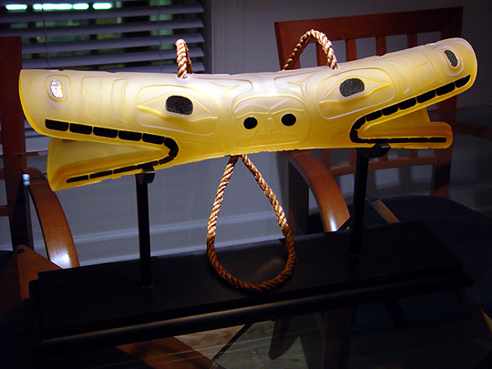 My first exposure to Preston Singletary's fairly unique take on glass art was at the Mint Museum of Craft + Design, here in Charlotte. The museum's collection includes one of Preston's well-known glass hats. These hats are modeled after Native American hats of the Pacific Northwest, and include sandblasted symbols such as wolves, ravens, eagles, and bears, all from Preston's tribe, the Tlingit (pronounced "klink it"). These symbols are unique to each tribe and can only be used by permission... since Preston is Tlingit, he's permitted to use their designs in his work. This work is modeled after a shamanic device known as a soul catcher, or Káa Yahaayí Shatl'ékwx'u in Tlingit. Soul catchers are carved from hollowed bone (such as the leg bones of a bear) and often contain inlays of abalone or other precious materials. Each end of a soul catcher is carved to resemble the head of an open-mouthed creature, such as a wolf or snake. In the Tlingit belief system, if a person's soul becomes lost while separated from the body during a dream, or if the soul is driven out by witchcraft, a shaman may be enlisted to find the soul, capture it in a soul catcher, and then restore it to the afflicted person, thereby preventing illness from invading the "empty" body. Soul catchers are prized possessions, and are handed down from shaman to shaman within a tribe over generations. To create this glass soul catcher, which is about four times the size of a real soul catcher, Preston first created a cylinder of glass in the approximate shape of the final form. He then used sandblasting and coldworking to create the mouth slits on each end of the work (four slits total). Next, Preston added tape to the outside of the work, stenciled and removed the areas of tape for the design he wanted to create, and then sandblasted away the glass to create the final design. To create the eyes, nostrils, and teeth (areas known as ovoids), Preston applied black Bullseye glass which had been iridized by exposing it to chemical fumes while in a molten state. The black glass was then affixed to the work with silicone. Because this glass is iridized, it may not appear black; the first time I saw an image of this work, it looked like gold leaf. This is the first work in which Preston has applied this technique, and it works really well. Preston then drilled two holes in the top of the soul catcher and added a section of rope hand-woven by Lisa Telford, a weaver of the Haida (pronounced "high dah") tribe, a sister tribe to the Tlingit. Finally, Preston coated the entire work in several layers of (believe it or not) Rain-X, the windshield treatment that repels water, to protect its surface. Because this work is very round, it can't just rest on a smooth surface... it wants to roll, which is not a good thing. And, because of the Rain-X coating that's all over the work, I couldn't attach any rubber or felt feet to stop it from rolling... they just wouldn't stick. So, when I spoke with Preston about this problem, he offered to have a stand designed that would display the work safely, and in a way that would accentuate the Tlingit influence in the work. Hahn Rossman of Alki Foundry designed and built the stand you see here... it does a wonderful job of displaying the work. This work is full of dualities. For example, Preston has managed to combine an ancient concept, the soul catcher, with modern concepts such as glass blowing and sandblasting... the result is high-tech, but primitive at the same time. Another example of duality in this work is its two heads... besides the intended Tlingit reference, this is similar to depictions of the Roman god Janus, who had one face looking to the past and one face looking to the future... it almost makes me think that in this soul catcher, one face is looking to the Tlingit's heritage, while the other is looking to their future. The artistry of the engravings, which are all based on Tlingit designs, is really spectacular... Preston knows how to translate designs from traditional media such as wood and stone to glass. This is an excellent example of Preston's work... I'm honored to have it in my collection. From July 2009 until some time in 2012, this work is on loan to the Museum of Glass in Tacoma, Washington, as part of Preston's show Preston Singletary: Echoes, Fire, and Shadows. It's a distinct honor to have been asked by the museum if they could borrow my soul catcher I hope that everyone who sees it in the show enjoys it (and the rest of the show, which is amazing). I know I'll miss having it around! Click here to return to the Collection. |