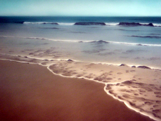 This is not, repeat not, a photograph. (Just in case you thought it was.) When I first saw one of the works from this series (this is the first in the series; there are at least two others) hanging on the wall at Jerald Melberg Gallery, my initial thought was "Wow, that's a pretty cool photograph." You can imagine my surprise when I moved closer and found that it was not actually a photograph, but a drawing executed in charcoal, pencil, and pastel by Richard Stenhouse. Of the three works in the series that I saw, this is the one that I liked the best. Huntington Beach State Park is located just a few miles south of Myrtle Beach, South Carolina... when I lived in Myrtle Beach (1973-1977), I visited the park several times, and I returned for a short visit in 2000. It remains totally undeveloped, in stark contrast to the endless miles of tourist beaches on both sides of the park. In this work, Richard has reproduced a calm beach scene with almost uncanny precision. The greyish brown of the wet sand, the gentle waves (there's a sandbar a ways out that prevents large waves from reaching the beach), the subtle blue of the sky, and the random nature of the foam in the waves are all pretty much perfect (at least as far as I am concerned). Like Richard's other works (see The Forbidden Room), this work has a dreamlike quality about it... nothing is too sharp, and the image blurs a bit as you get closer to its edge. It seems like a memory, recorded onto mylar for all to see. One thing that I really like about this work is how it contrasts with my first Stenhouse, The Forbidden Room. While The Forbidden Room is largely an exercise in straight lines, architectural perfection, and use of monochrome shading, Huntington Beach contains almost no straight lines, has no architecture whatsoever, and uses a subtle amount of color. Between these two works, Stenhouse's view of reality is, I think, quite well covered. Scroll down to see a closeup shot of this work. Click here to return to the Collection. |