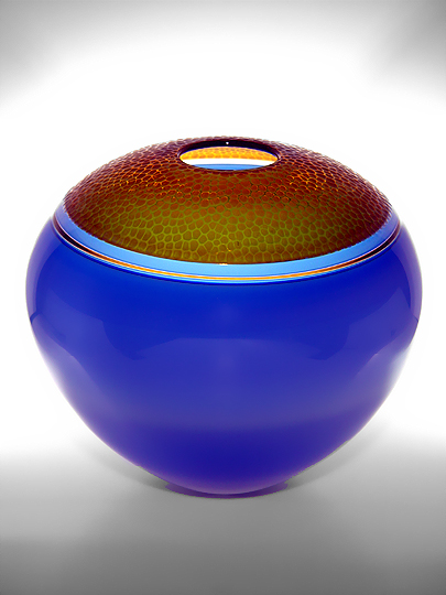Continuing what has become a tradition, this is the first work that Sonja created in 2002... my "Collection of Firsts" also includes the first works that Sonja created in 1999 (B199), 2000 (B100), and 2001 (B101). This work is quite different from my previous Blomdahls... rather than a bowl/vase shape, this work is more spherical. In fact, Sonja used to call works in this shape "spheres", and even used to begin their names with "SP" for sphere, as opposed to "B" for the bowl/vase shapes. (Now they all have names that start with "B".) This work is created using the same incalmo technique that Sonja uses for her vases, but with a couple of different twists. While her vases usually include necks and large, flaring tops, this oblate sphere form uses a very simple transition between the upper and lower sections of the work. Using her considerable skill, Sonja created the upper section of the sphere with amber glass on the inside and green glass on the outside, and a thin band of clear glass separating the amber and green from the sky blue of the lower section. Once the glass was annealed, Sonja sent the work to a coldworking shop, where a grinding wheel was used to very carefully grind away most of the green glass to create a delicate web of green glass enclosing patches of amber glass. The result reminds me very much of what plant cells look like under a microscope. (Sonja's older spheres did not incorporate this technique.) I think this work is great... I love its form, I think the webwork of green and amber glass is incredible, and as always, Sonja has developed a set of colors that look awesome together. Scroll down to see more shots of this work. Click here to return to the Collection. |