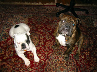 BEAU and SADIE Beau (on the right) and Sadie live with my friends Harvey and Vivian Yancey. Beau and Sadie are English bulldogs... they're both very well trained. Even though she is smaller and younger, Sadie is definitely the dominant dog in this pair. |
