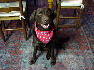 MAGGIE Maggie lives with my sister Lee Kennedy, her husband Don Kennedy, and their son (my nephew) Will Kennedy. Maggie is a chocolate labrador retriever. She is very intelligent and knows how to obey commands like "sit", "stay", and "drop it", although when she sits she tends to back up several steps first (similar to hound-around, but in her case it's called wiggle-butt). Maggie also likes to jump on people and chew on things. |