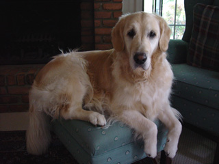MANDY Mandy lives with Clay Johanson (my dad) and his wife Gwen Johanson. Mandy is a purebred golden retriever from the same line as Hero. Mandy is a descendant of one of Hero's sisters, so it's nice to have another dog from the same dog family in our family. Unlike Hero, who was pretty much completely undisciplined, Mandy is very well-behaved, and won't run off when you let her outside. Mandy loves to sit in chairs, just like real people. She is a real sweetie. |